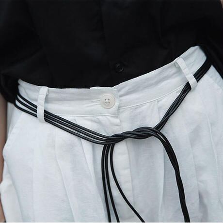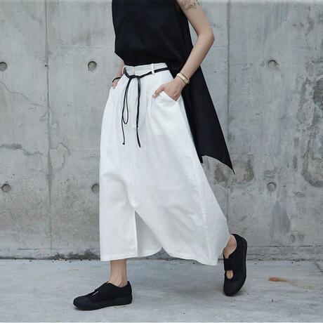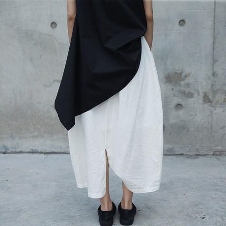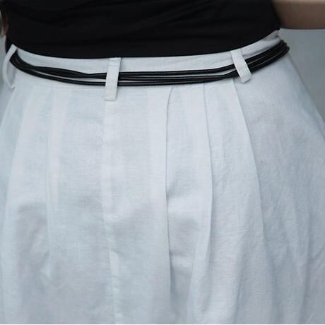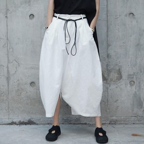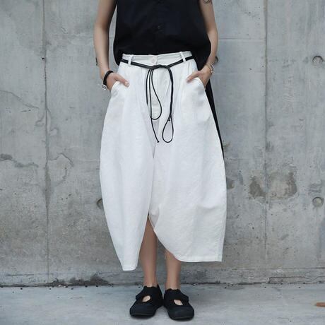 丸いアーク型のデザインがオリジナルティーあるユニークなパンツスカート。高品質のさらりと洗いのかかったリネン素材をチョイス、快適ながらボリュームあるシルエット。ワックスロープベルト付き、内側には膝まで薄いコットン裏地付き。デイリーのカジュアルなスタイルとの合わせも◎パーティーシーンにもオススメするアイテム。