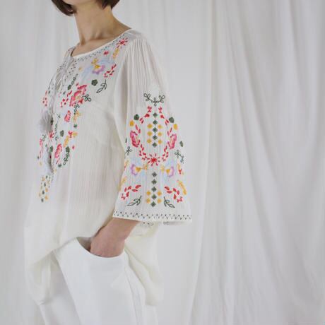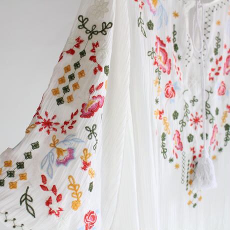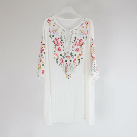 花柄の刺繍がキュートなドレス。柔らかく軽いコットン素材は真夏にも心地よく、ふんわりします。ゆったりとしたボクサーシルエットも魅力。春夏のマストアイテム。