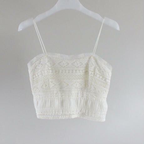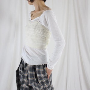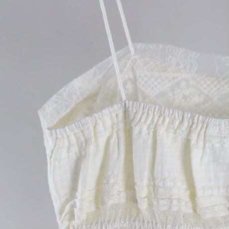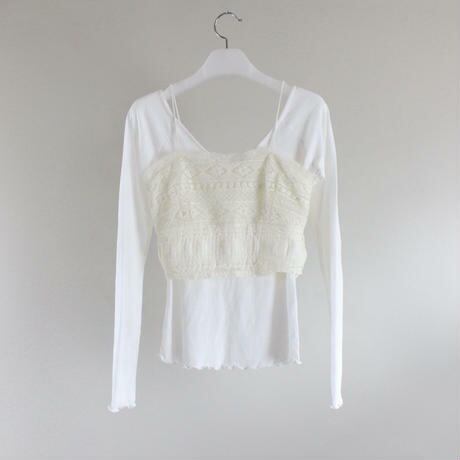 フレンチスタイルの2ピーススーツ。Vネックのトップスにキュートなスリングレースを合わせたアイテム。レーストップは細い帯のレースの一種です。デイリのスタイルにレイヤードで楽しむアイテム。