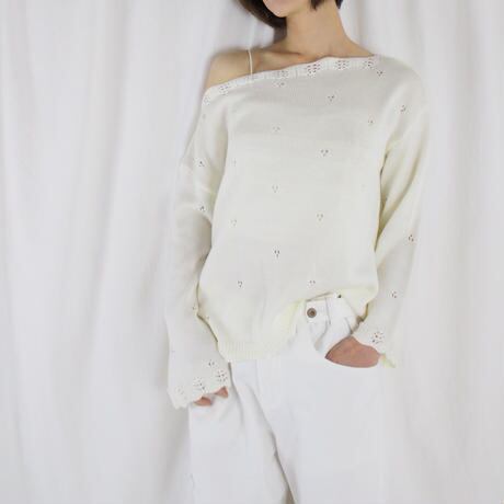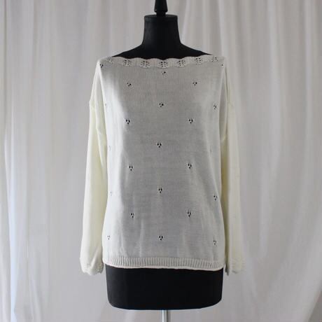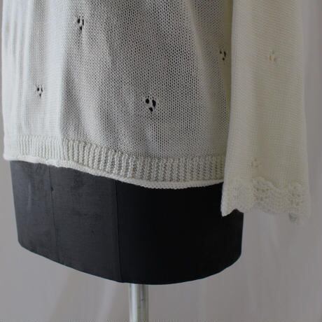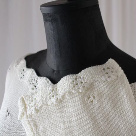 ヴィンテージ風レース編みがふんわりと柔らかいセーター。ルーズなネックラインがレディーな、トランペットスリーブの女性らしいアイテム。