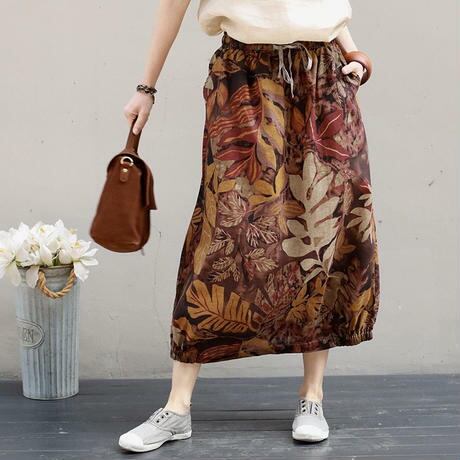 リネンリーププリントスカート。素材の質感を活かしたナチュラルな仕上がり。リーププリント柄と、裾に行くほどふんわりシルエットがカワイイアイテム。