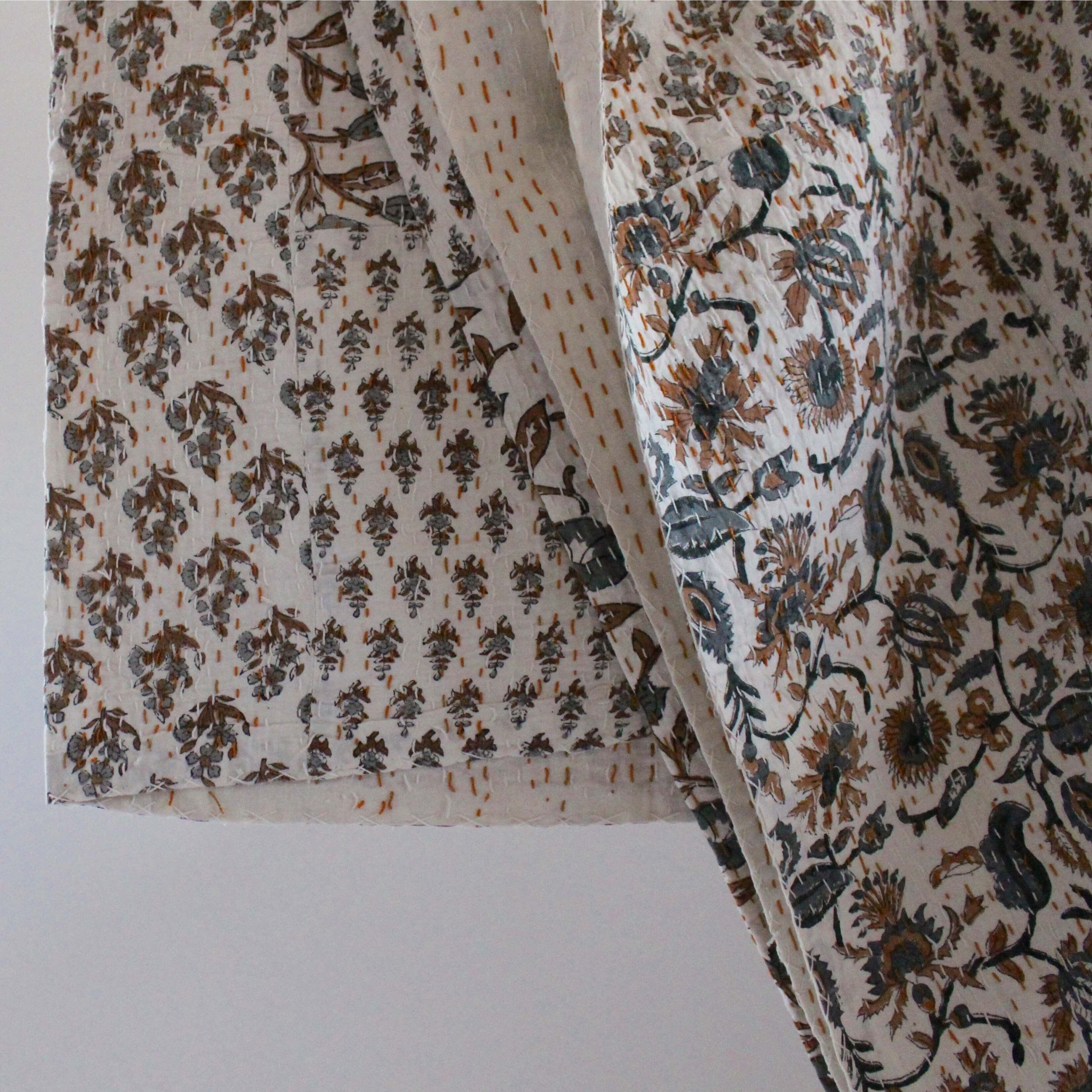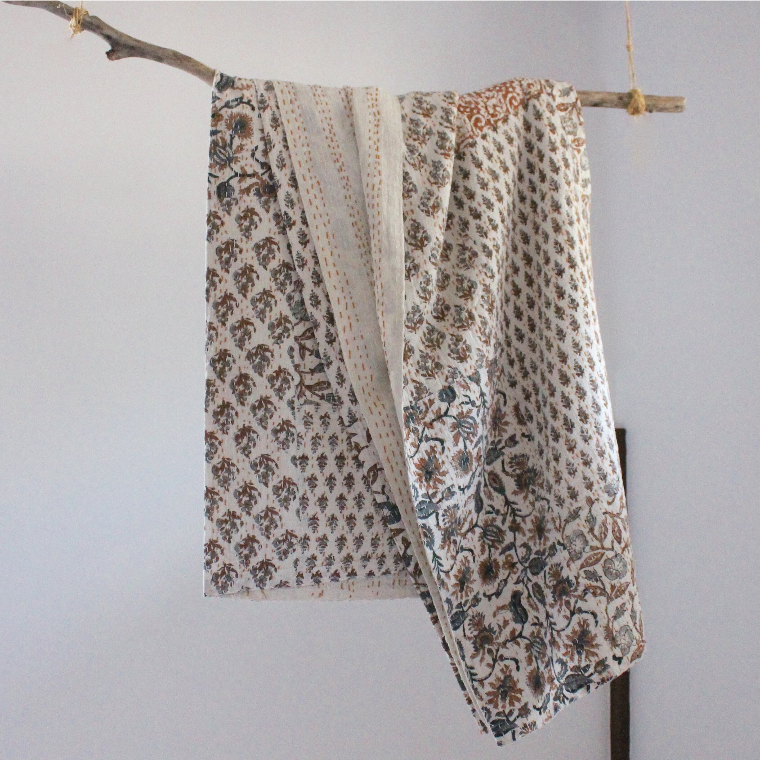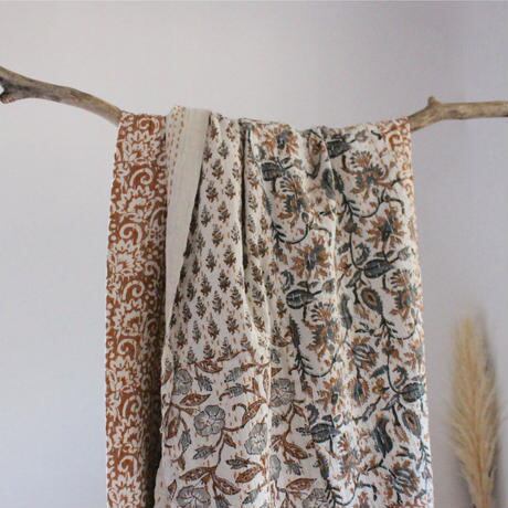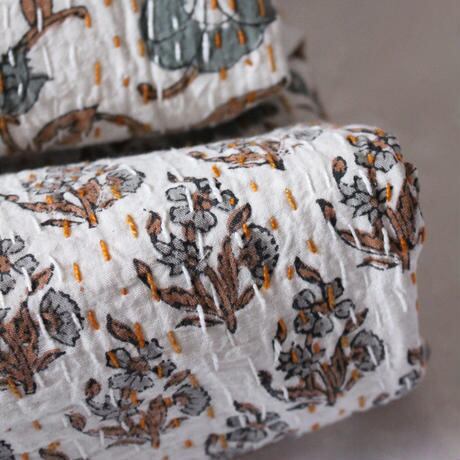 インドの職人によって柔らかくキルティングされたヴィンテージ風カンタキルトです。何千もの小さくて繊細なファインカンタステッチでできており、手縫いされた刺繍はとても温かみが感じられます。パッチワークされた美しい柄、落ち着いた色合いはヨーロッパ エッセンス。日本のスペースにも違和感なくフワッと包み込まれるような心地よさを味わえます。季節を問わずご使用頂けます。