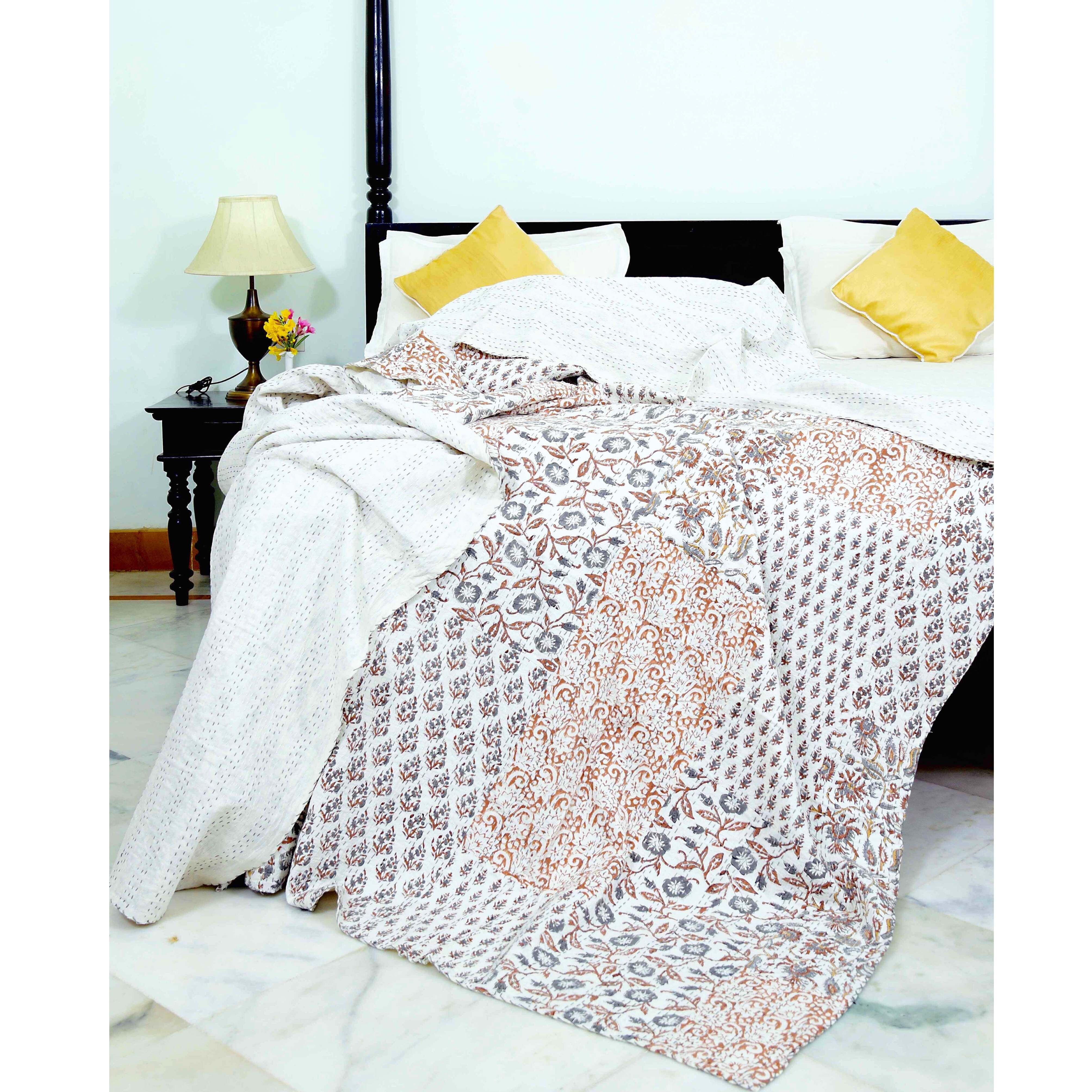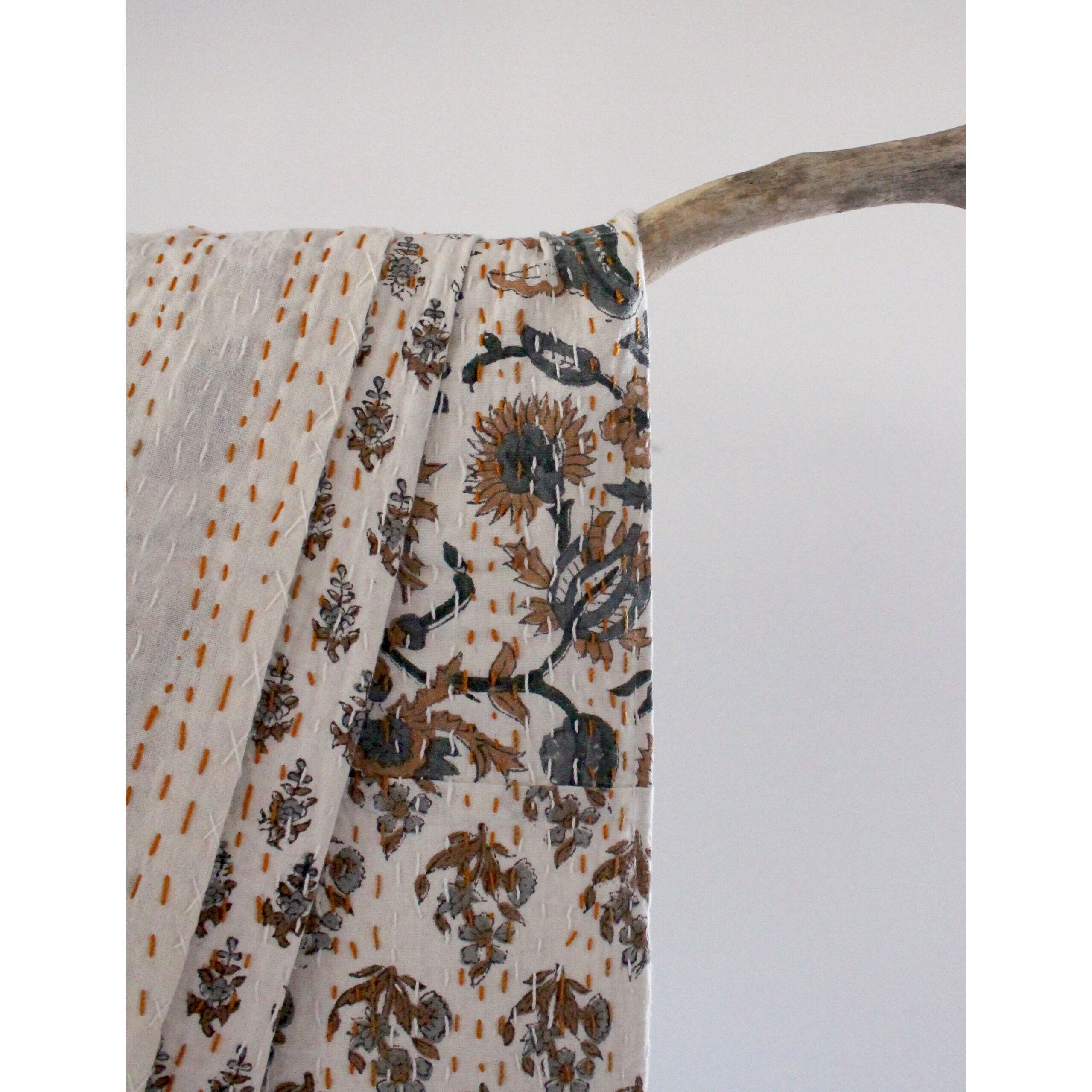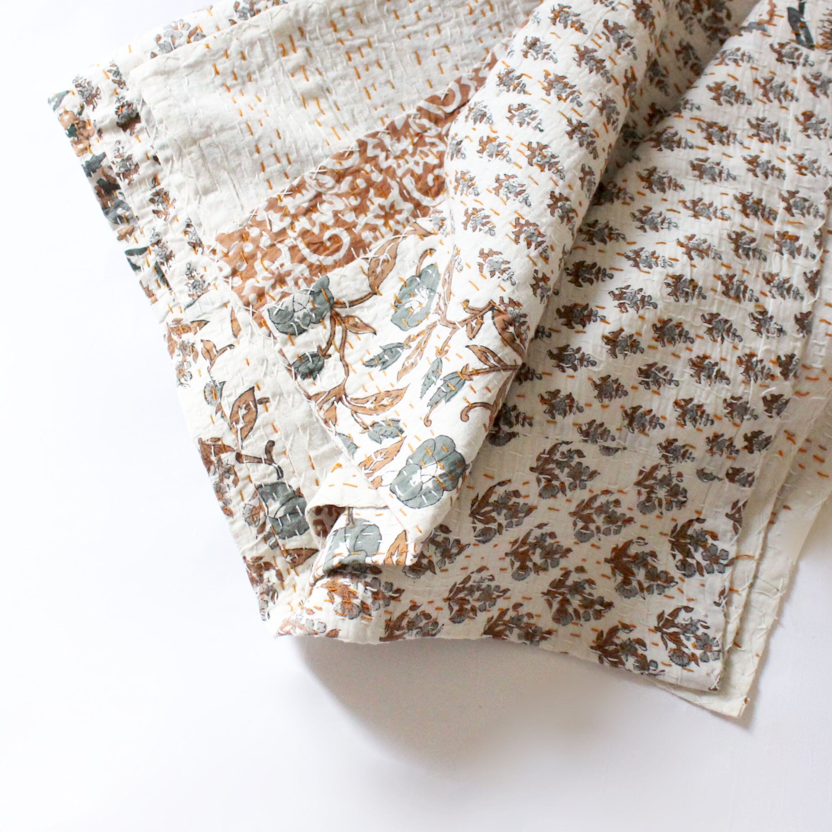 インドの職人によって柔らかくキルティングされたヴィンテージ風カンタキルトです。何千もの小さくて繊細なファインカンタステッチでできており、手縫いされた刺繍はとても温かみが感じられます。パッチワークされた美しい柄、落ち着いた色合いはヨーロッパ エッセンス。日本のスペースにも違和感なくフワッと包み込まれるような心地よさを味わえます。季節を問わずご使用頂けます。